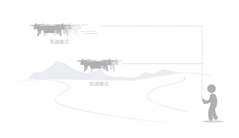 有两种飞行模式可供切换:低速模式跟高速模式。